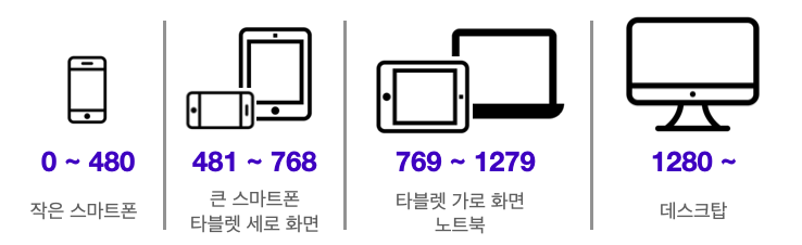 Column은 콘텐츠가 위치하게 될, 세로로 나누어진 영역이다. 컬럼 개수를 임의로 나눌 수도 있지만, 표준적으로 휴대폰에서 4개, 태블릿에서 8개, PC에서는 12개의 컬럼으로 나눈다. 각 디바이스의 화면 크기는 보통 아래 이미지와 같다. 이미지 속 화면 크기의 구분선을 break point라고 한다. 내가 만들고자 하는 UI가 어디에 속하는지 파악하고 컬럼 개수를 정하면 된다.